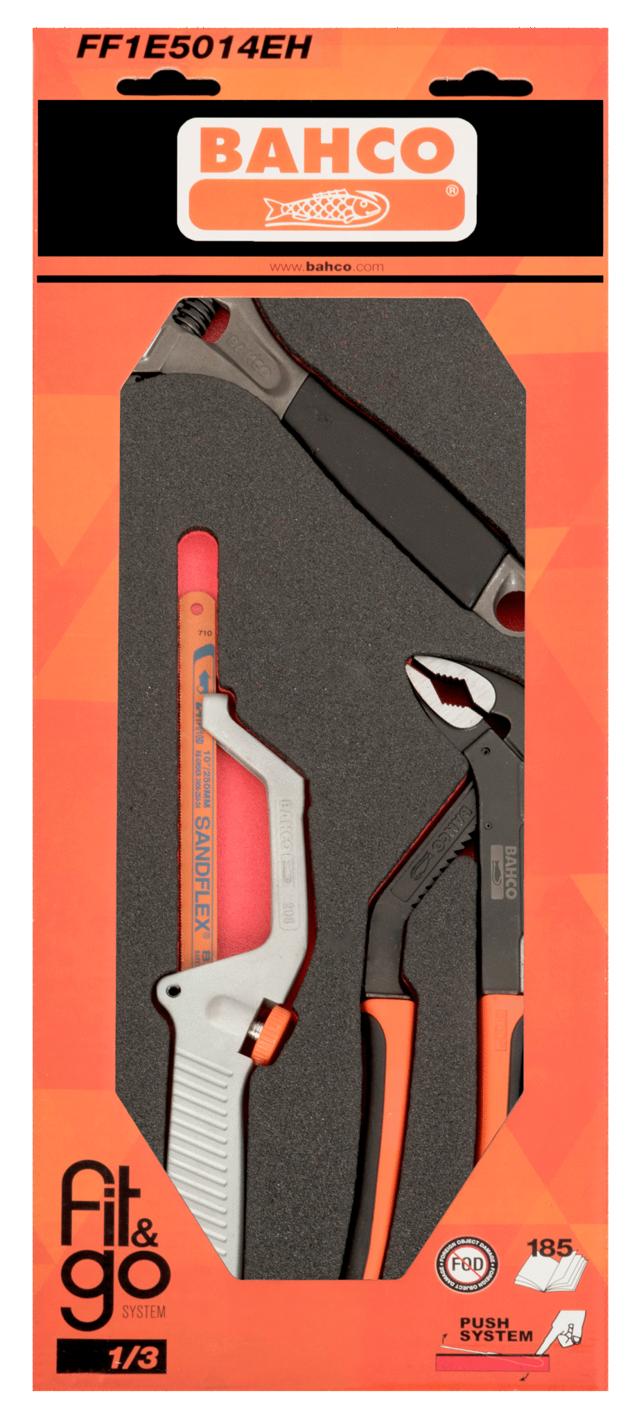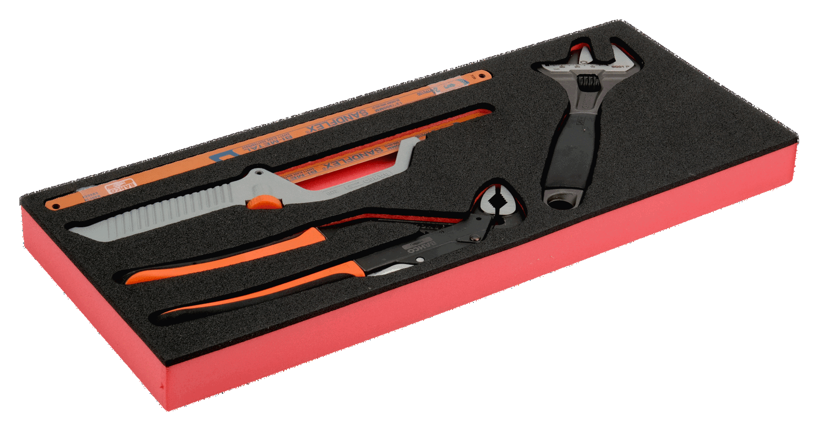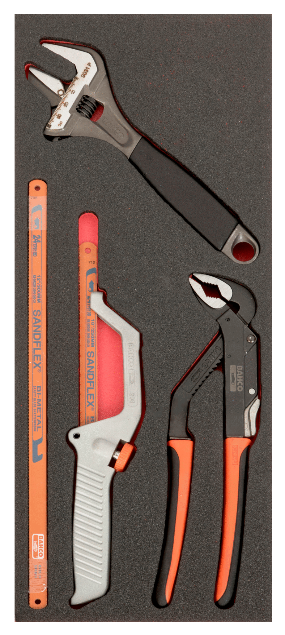 Wkładka z pianki 1/3 z narzędziami, Klucz nastawny 9031P, Szczypce nastawne 8224, Ramki do brzeszczotów 208, Brzeszczoty ręczne Sandflex 3906-300-24-5P BAHCO