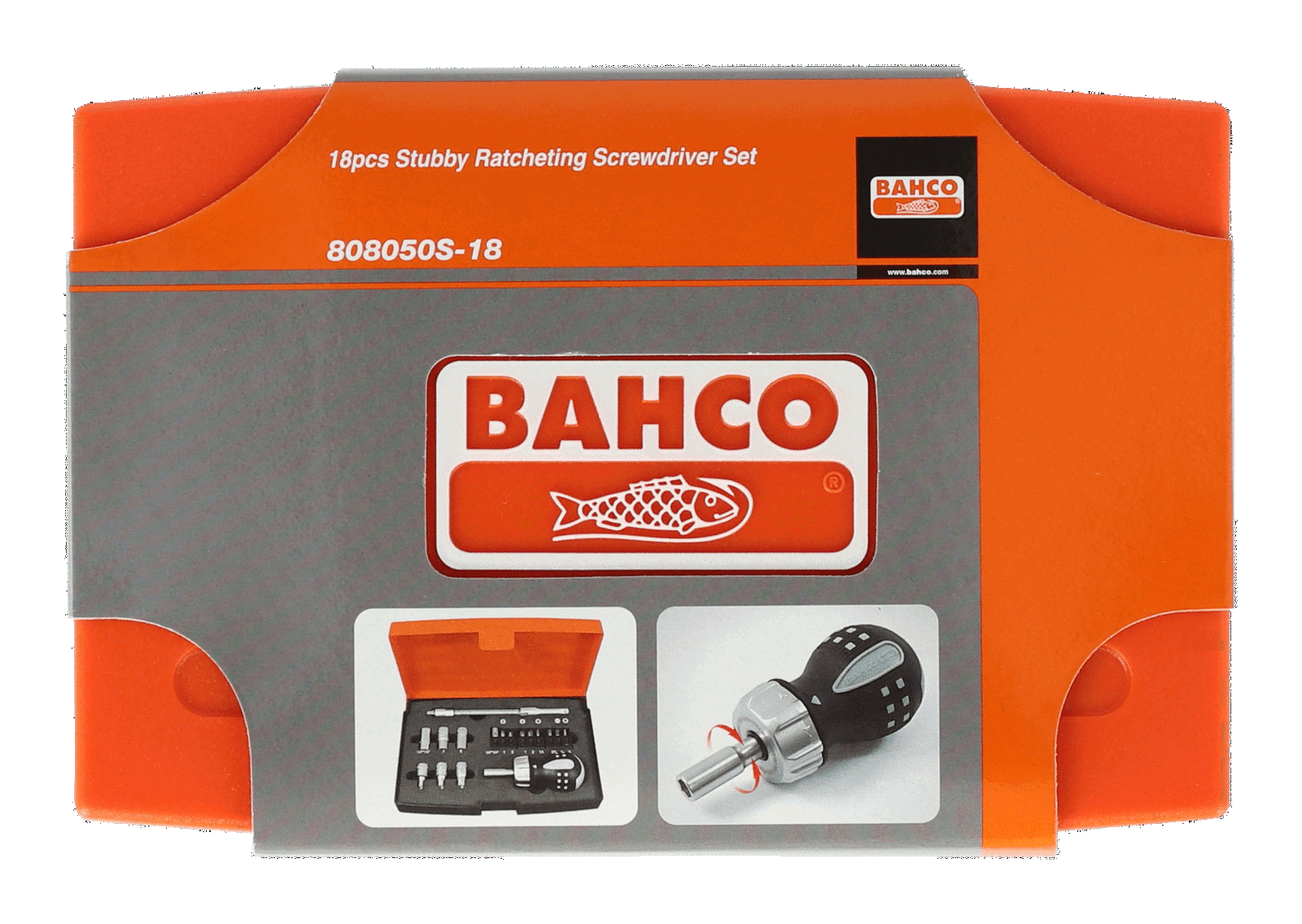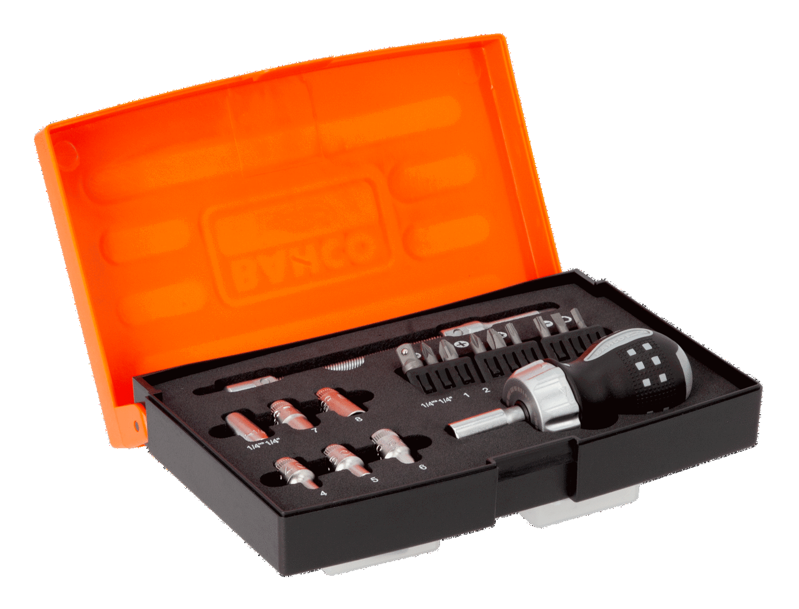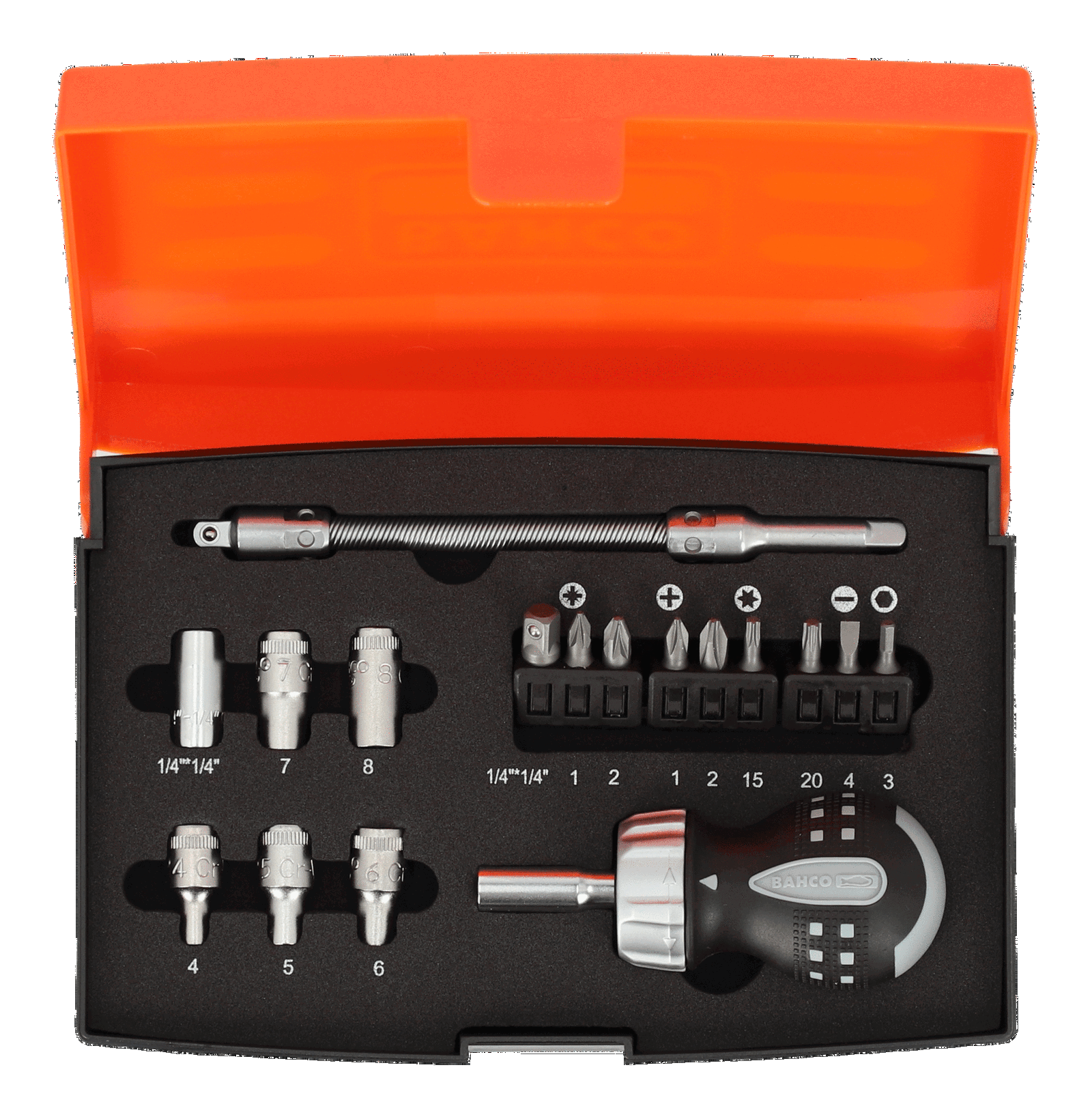 Wkrętak grzechotkowy krótki z zestawem 18 elementów: bity i nasadki 1/4″ BAHCO