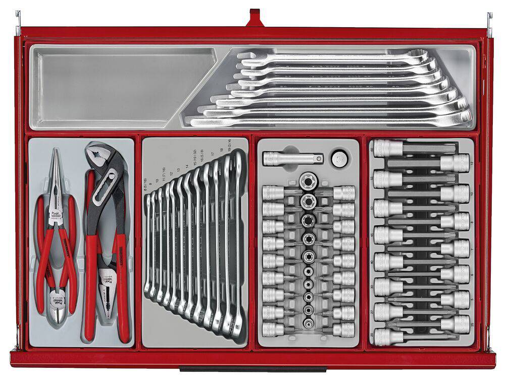 - Kompleksowy zestaw narzędzi z różnymi nasadkami, kluczami, wkrętakami, szczypcami i specjalistycznymi narzędziami do różnych zadań mechanicznych