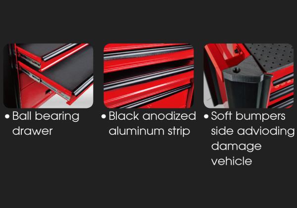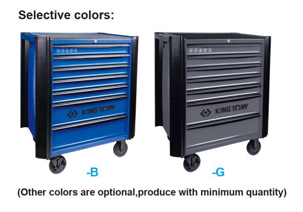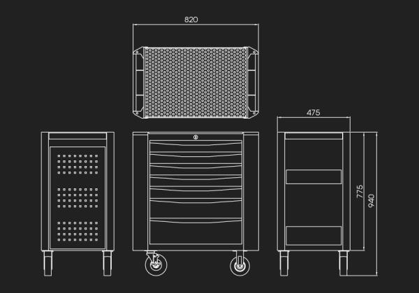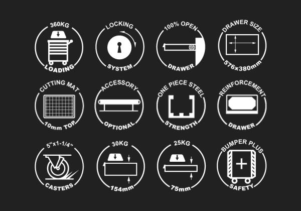 Wymiary ogólne wózka:z kółkami: wys.97 x szer. 82 x gł. 45,5 cm bez kółek: wys.80 x szer. 82 x gł. 45,5 cm5 szuflad o wymiarach: 576 x 380 x 75 mm (ładowność 1 szuflady – 25 kg) 2 szuflady o wymiarach: 576 x 380 x 154 mm (ładowność 1 szuflady – 30 kg) Wymiary kółek: 5” x 1-1/4” Ładowność: 360 kg. Miękkie ochraniacze na narożnikach Dwa boczne uchwyty i przemysłowe kółka TPR ułatwiają przemieszczanie wózka. Łożyskowane szuflady. Jednoczęściowy stalowy korpus. Centralny zamek Góra zabezpieczona 10 mm matą Karta produktu – 87634-7B