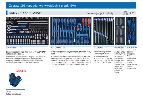 Zestaw 196 narzędzi King Tony w 5 modułach, dedykowany do wózków narzędziowych (wkłady piankowe EVA, zajmuje 3 szuflady wózka (szuflady 576 x 380 mm)). Moduł 1: nasadki długie 6-kątne 1/4″ w rozmiarach 4, 4.5, 5, 5.5, 6, 7, 8, 9, 10, 11, 12, 13 mm, nasadki krótkie 6-kątne 1/4″ w rozmiarach 4, 4.5, 5, 5.5, 6, 7, 8, 9, 10, 11, 12, 13 mm, nasadki z bitem TORX 3/8″ o długości 50 mm: T10, T15, T20, T25, T27, T30, T40, T45, T50, nasadki z bitem HEX 3/8″ o długości 50 mm: H3, H4, H5, H6, H8, H10, H12, nasadki długie 6-kątne 3/8″ w rozmiarach 10, 12, 13, 14, 15, 16, 17, 18, 19, 21 mm, nasadki krótkie 6-kątne 3/8″ w rozmiarach 8, 10, 11, 12, 13, 14, 15, 16, 17, 18, 19, 20, 21, 22 mm, nasadki do świec 6-kątne 3/8″ w rozmiarach 16, 21 mm, nasadka do świec 12-kątna 3/8″ 14 mm, nasadki krótkie 6-kątne 1/2″ w rozmiarach 10, 12, 13, 14, 15, 16, 17, 18, 19, 20, 21, 22, 23, 24, 27, 28, 30, 32 mm, grzechotka 1/4″ z przyciskiem zwalniającym 24 zęby, grzechotka 1/4″ z przyciskiem zwalniającym 32 zęby, grzechotka 1/4″ z przyciskiem zwalniającym 32 zęby, przedłużki 1/4″ 54, 100 mm, 3/8″ 75, 250 mm, 1/2″ 125, 250 mm, przegub kardana 1/4″, 3/8″, 1/2″, pokrętło łamane 1/2″, adapter 1/4″ na 3/8″, redukcje 3/8″ na 1/4″ oraz 1/2″ na 3/8″, uchwyt trzpieniowy do wkrętarek 1/4″ na nasadki 1/4″ oraz 3/8″, długość 50 mm. (moduł 9-9503MRV01) Moduł 2: wkrętaki – krzyżak nr 2×38 mm, nr 1×80 mm, nr 2×100 mm, nr 3×150 mm, płaskie 3×75 mm, 4×100 mm, 5.5×100 mm, 6.5×100 mm, 10×200 mm, 6.5×38 mm, TORX T6x48 mm, T7x48 mm, T8x75 mm, T9x75 mm, T10x75 mm, T15x75 mm, T20x100 mm, T25x100 mm, T27x100 mm, T30x125 mm, T15x250 mm, T20x250 mm, T25x250 mm, T30x250 mm (9-31124MRV) Moduł 3: klucze płasko-oczkowe 6-19, 21, 22, 24, 27, 30, 32 mm. (9-1220MRV) Moduł 4: zestaw bitów 10 mm: bity 10 mm krótkie (długość 36 mm) HEX (imbus) H4, H5, H6, H7, H8, H10, H12, bity 10 mm krótkie (długość 36 mm) SPLINE M5, M6, M8, M10, M12, bity 10 mm krótkie (długość 36 mm) TORX T20, T25, T27, T30, T40, T45, T50, T55, T60, bity 10 mm długie (długość 80 mm) HEX (imbus) H4, H5, H6, H7, H8, H10, H12, bity 10 mm długie (długość 80 mm) SPLINE M5, M6, M8, M10, M12, bity 10 mm długie (długość 80 mm) TORX T20, T25, T27, T30, T40, T45, T50, T55, T60, adapter do bitów 10 mm na napęd (kwadrat) 3/8″ oraz 1/2″. (9-1044CQV) Moduł 5: szczypce uniwersalne wąskie dł. 200mm, szczypce uniwersalne 163mm, szczypce tnące boczne dł. 188mm, szczypce uniwersalne długie wąskie dł. 280mm (9-40104GPV)