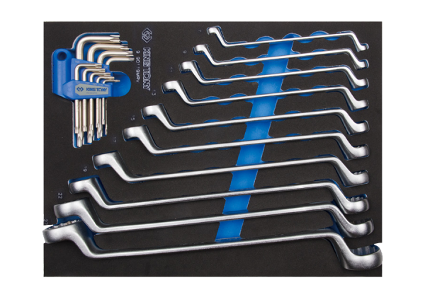 ZESTAW 19cz. KLUCZE OCZKOWO ODGIĘTE 6 – 32mm + TORX T10 – T50, WKŁAD Z PIANKI EVA DO WÓZKA King Tony