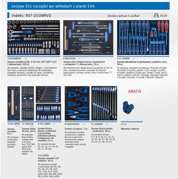 Zestaw 251 narzędzi King Tony w 9 modułach, dedykowany do wózków narzędziowych (wkłady piankowe, zajmuje 5 szuflad wózka (szuflady 576 x 380 mm)). Moduł 1: nasadki długie 6-kątne 1/4″ w rozmiarach 4, 4.5, 5, 5.5, 6, 7, 8, 9, 10, 11, 12, 13 mm, nasadki krótkie 6-kątne 1/4″ w rozmiarach 4, 4.5, 5, 5.5, 6, 7, 8, 9, 10, 11, 12, 13 mm, nasadki z bitem TORX 3/8″ o długości 50 mm: T10, T15, T20, T25, T27, T30, T40, T45, T50, nasadki z bitem HEX 3/8″ o długości 50 mm: H3, H4, H5, H6, H8, H10, H12, nasadki długie 6-kątne 3/8″ w rozmiarach 10, 12, 13, 14, 15, 16, 17, 18, 19, 21 mm, nasadki krótkie 6-kątne 3/8″ w rozmiarach 8, 10, 11, 12, 13, 14, 15, 16, 17, 18, 19, 20, 21, 22 mm, nasadki do świec 6-kątne 3/8″ w rozmiarach 16, 21 mm, nasadka do świec 12-kątna 3/8″ 14 mm, nasadki krótkie 6-kątne 1/2″ w rozmiarach 10, 12, 13, 14, 15, 16, 17, 18, 19, 20, 21, 22, 23, 24, 27, 28, 30, 32 mm, grzechotka 1/4″ z przyciskiem zwalniającym 24 zęby, grzechotka 1/4″ z przyciskiem zwalniającym 32 zęby, grzechotka 1/4″ z przyciskiem zwalniającym 32 zęby, przedłużki 1/4″ 54, 100 mm, 3/8″ 75, 250 mm, 1/2″ 125, 250 mm, przegub kardana 1/4″, 3/8″, 1/2″, pokrętło łamane 1/2″, adapter 1/4″ na 3/8″, redukcje 3/8″ na 1/4″ oraz 1/2″ na 3/8″, uchwyt trzpieniowy do wkrętarek 1/4″ na nasadki 1/4″ oraz 3/8″, długość 50 mm. (moduł 9-9503MRV01) Moduł 2: szczotka druciana, komplet 5 pilników do metalu, 2x narzędzie do zdejmowania tapicerki, skrobak, T45 z uchwytem typu T dł. 200 mm, klucze nasadowe typu T uchwyt plastikowy 8, 10, 13 mm dł. 388 mm (9-90413TQV) Moduł 3: wkrętaki – krzyżak nr 2×38 mm, nr 1×80 mm, nr 2×100 mm, nr 3×150 mm, płaskie 3×75 mm, 4×100 mm, 5.5×100 mm, 6.5×100 mm, 10×200 mm, 6.5×38 mm, TORX T6x48 mm, T7x48 mm, T8x75 mm, T9x75 mm, T10x75 mm, T15x75 mm, T20x100 mm, T25x100 mm, T27x100 mm, T30x125 mm, T15x250 mm, T20x250 mm, T25x250 mm, T30x250 mm (9-31124MRV) Moduł 4: młotek 395g, punktak fi 4 mm, przecinak 17 mm, 20 mm, wybijak igłowy fi 3, 4, 5, 6mm (9-90118PRV) Moduł 5: zestaw bitów 10 mm: bity 10 mm krótkie (długość 36 mm) HEX (imbus) H4, H5, H6, H7, H8, H10, H12, bity 10 mm krótkie (długość 36 mm) SPLINE M5, M6, M8, M10, M12, bity 10 mm krótkie (długość 36 mm) TORX T20, T25, T27, T30, T40, T45, T50, T55, T60, bity 10 mm długie (długość 80 mm) HEX (imbus) H4, H5, H6, H7, H8, H10, H12, bity 10 mm długie (długość 80 mm) SPLINE M5, M6, M8, M10, M12, bity 10 mm długie (długość 80 mm) TORX T20, T25, T27, T30, T40, T45, T50, T55, T60, adapter do bitów 10 mm na napęd (kwadrat) 3/8″ oraz 1/2″. (9-1044CQV) Moduł 6: klucze płasko-oczkowe z grzechotką jednokierunkową 72 zęby w rozmiarach 10, 11, 12, 13, 14, 15, 16, 17, 19 mm oraz trzy adaptery do nasadek umożliwiające wykorzystanie kluczy 10, 13 i 19 mm odpowiednio jako grzechotki 1/4″, 3/8″ i 1/2″. (9-10112MRV) Moduł 7: nasadki 1/2” z bitami HEX 3-8, 10, 12, 14, 17, 19 mm dł.60 mm, SPLINE M5, M6, M8, M10, M12, M14 dł. 60mm, SPLINE z otworem M16, M18 dł.66mm (9-4129PRV) Moduł 8: szczypce do pierścieni segera zewnętrzne i wewnętrzne proste oraz wygięte 19-60 mm, szczypce tnące boczne, kombinerki, szczypce uniwersalne wąskie (9-40207GPV02) Moduł 9: klucze płasko-oczkowe 6-19, 21, 22, 24, 27, 30, 32 mm. (9-1220MRV)