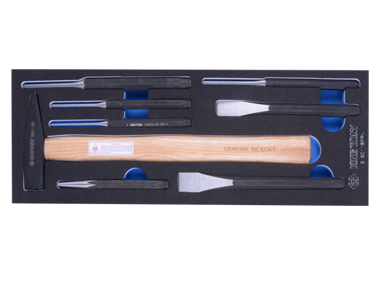 ZESTAW 8cz. PRZECINAKI 17 – 20mm + PUNKTAK 4mm + WYBIJAKI 3 – 6mm + MŁOTEK 7821-30 ,WKŁAD Z PIANKI, DO WÓZKA