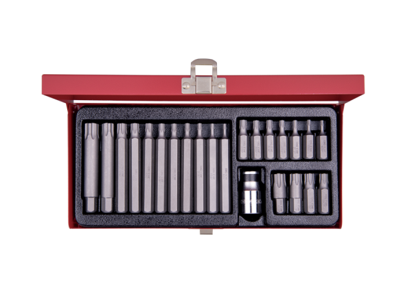 W skład zestawu wchodzą bity 10 mm krótkie (36 mm ) oraz długie (80 mm ) o rozmiarach: 10IP, 15IP, 20IP, 25IP, 27IP, 30IP, 40IP, 45IP, 50IP, 55IP, 60IP. Bity wykonane są z wytrzymałej stali S2, olejowane antykorozyjnie i piaskowane, adapter ze stali chromowo-wanadowej, chromowany. Zestaw w metalowej kasecie. Karta produktu – 1023eq