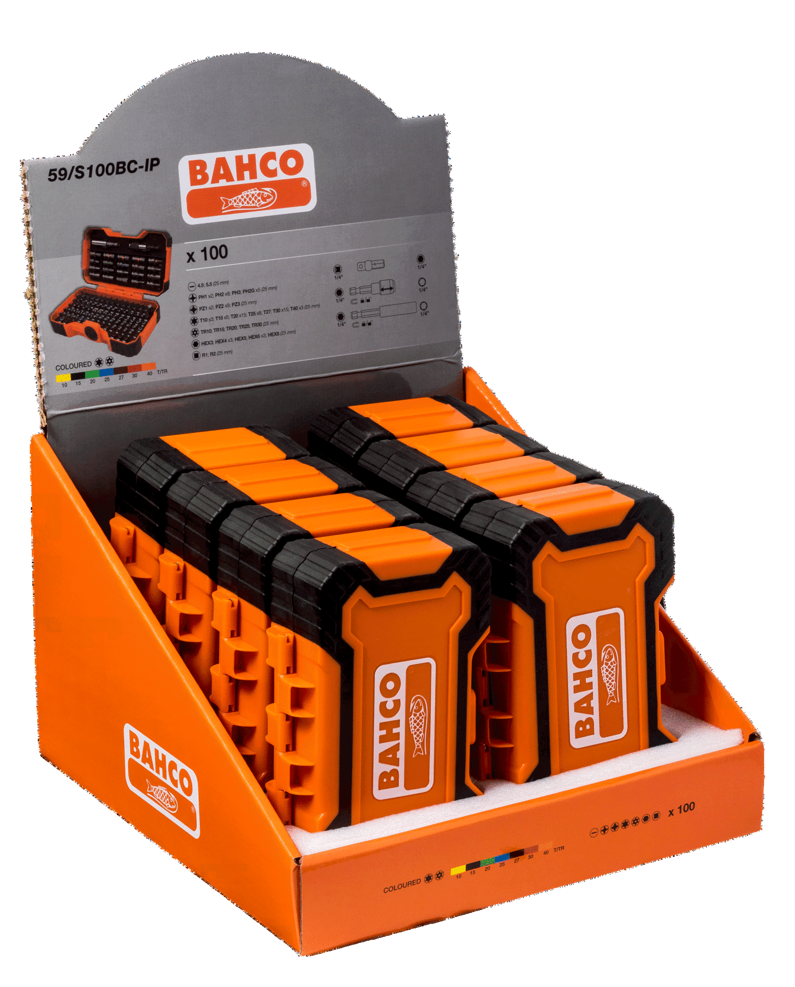 Zestaw bitów przemysłowy 100 elementowy do śrub prostych, imbusowych, Phillips, Pozidriv, Robertson, TORX oraz TORX z otworem BAHCO (8 szt.)
