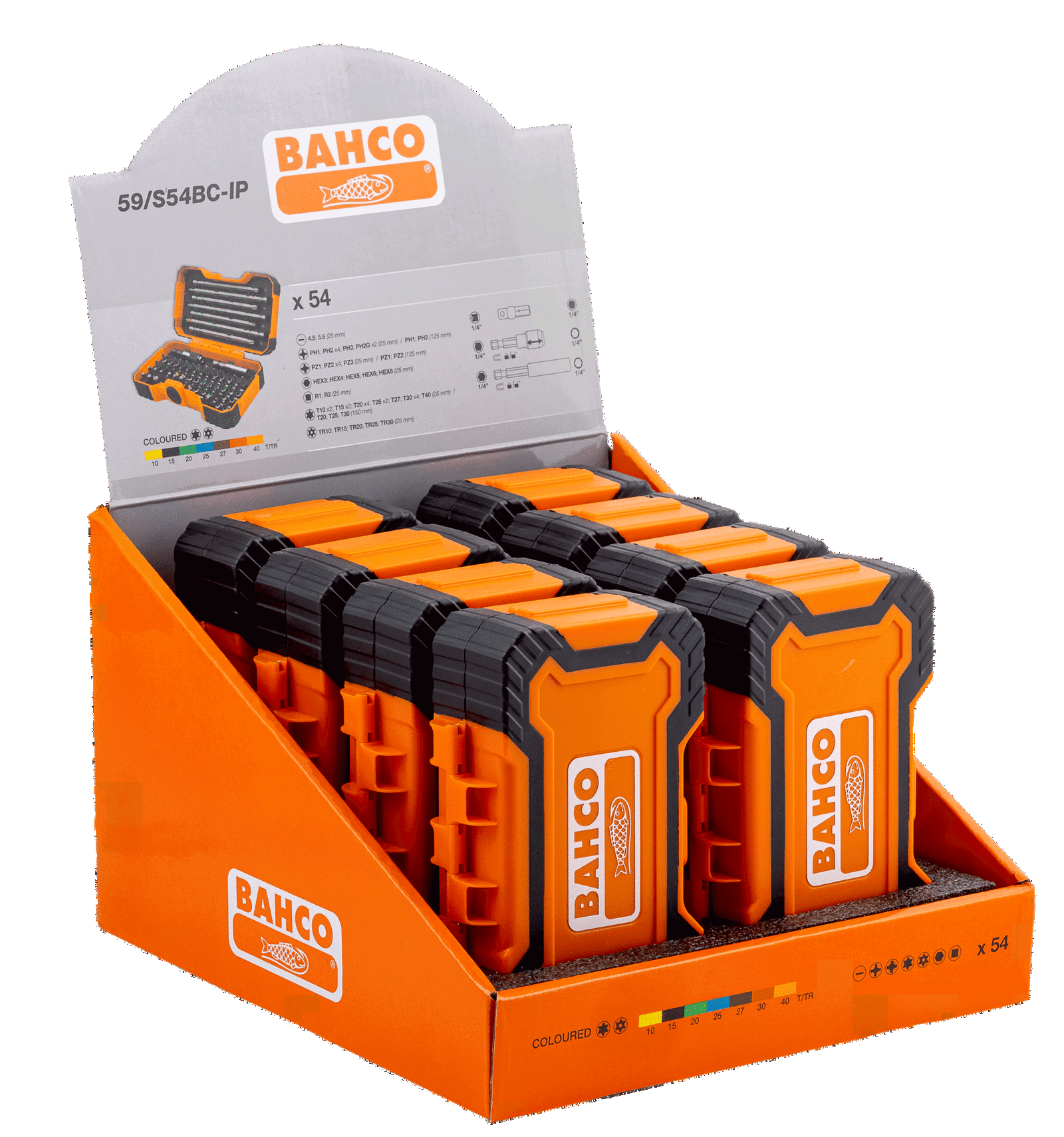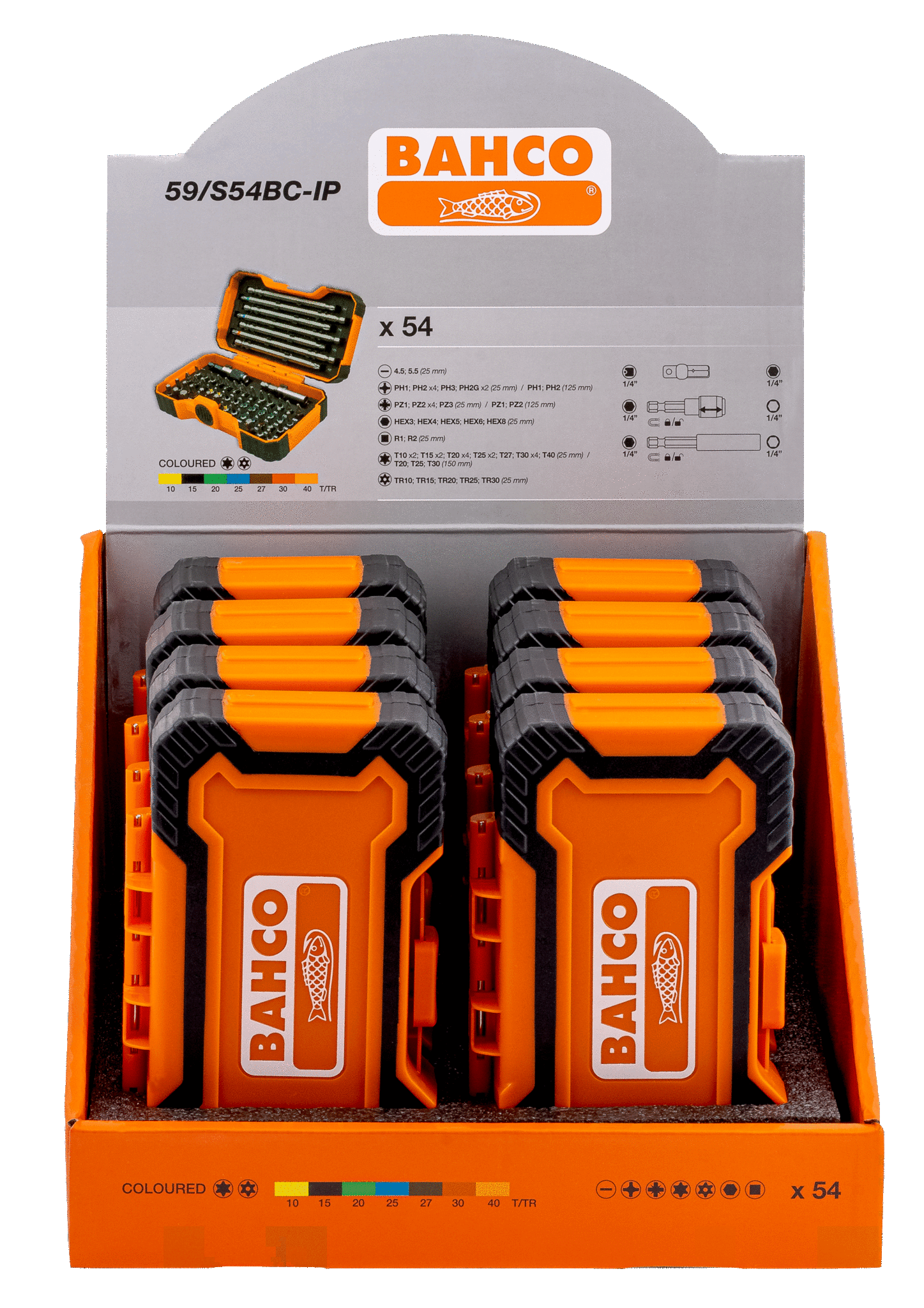 Zestaw bitów przemysłowych 54 szt. sześciokątne, płaskie, Phillips, Pozidriv, Robertson, TORX z otworem, kolorowe TORX BAHCO (8 szt.)
