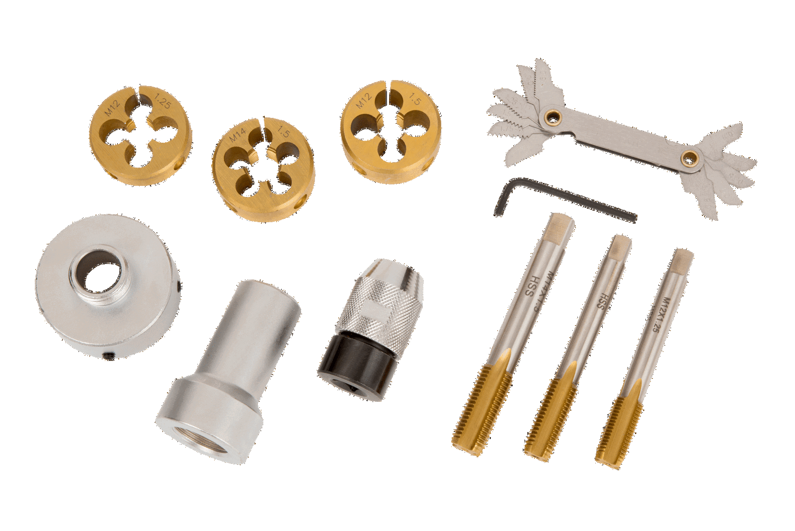 - Noże do najbardziej popularnych rozmiarów gwintów męskich i damskich. M12x1.25, M12x1.50 oraz M14x1.50