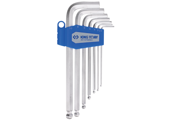 Zestaw 7 kluczy imbusowych HEX z kulką profesjonalnej marki King Tony. W zestawie znajdują się długie imbusy z serii 1130xxM w rozmiarach 2.5, 3, 4, 5, 6, 8, 10 [ mm ]. Zestaw w plastikowym uchwycie. Kulka na końcu dłuższego ramienia klucza pomaga odkręcać śruby o utrudnionym dostępie pod kątem. Karta produktu – 20107MR01