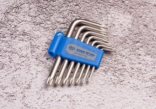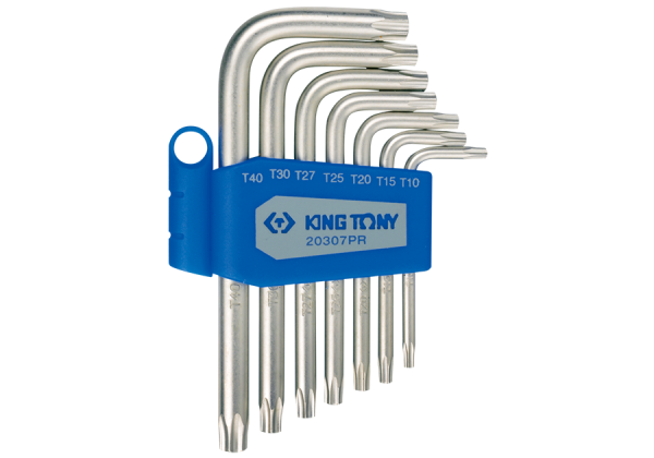 Zestaw imbusów TORX w plastikowym uchwycie. W zestawie znajdują się imbusy o rozmiarach T10, T15, T20, T25, T27, T30 oraz T40. Narzędzia firmy King Tony, wykonane z wysokiej jakości materiałów Karta produktu – 20307PR
