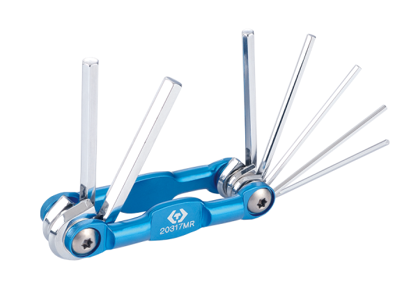 Lekki, aluminiowy scyzoryk z zestawem narzędzi HEX. W scyzoryku znajdują się klucze w rozmiarach H1.5, H2, H2.5, H3, H4, H5, H6. Karta produktu – 20317MR