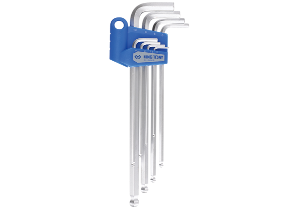 Zestaw 8 ekstra długich imbusów HEX z kulką firmy King Tony. W zestawie znajdują się imbusy w rozmiarach metrycznych [ mm ]: 2, 2.5, 3, 4, 5, 6, 8, 10. Kulka na końcu dłuższego ramienia klucza pomaga odkręcać śruby o utrudnionym dostępie pod kątem. Zestaw w plastikowym uchwycie do narzędzi Karta produktu – 20108MR