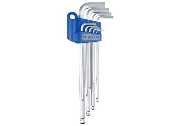 Zestaw 9 ekstra długich imbusów z kulką firmy King Tony. W zestawie imbusy w rozmiarach [ mm ]: 1.5, 2, 2.5, 3, 4, 5, 6, 8, 10. Kulka na końcu dłuższego ramienia klucza pomaga odkręcać śruby o utrudnionym dostępie pod kątem. Zestaw plastikowym uchwycie. Karta produktu – 20109MR