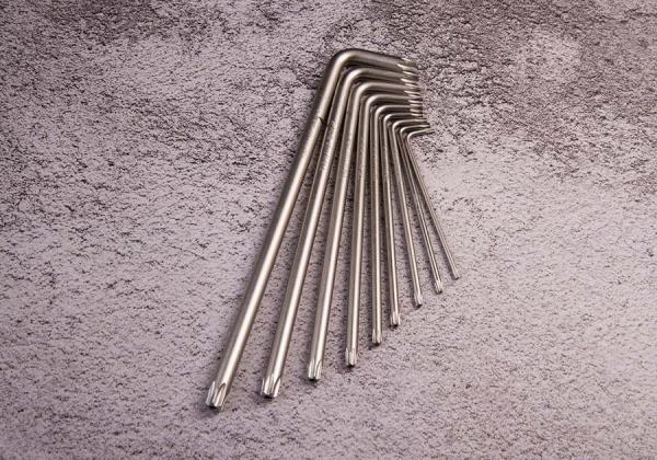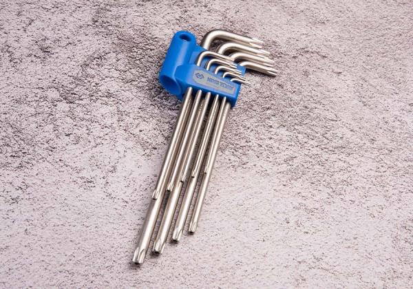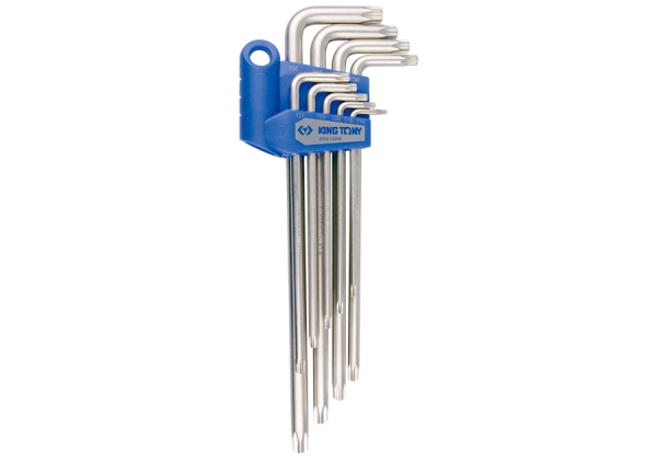 Zestaw extra długich imbusów typu TORX z otworem w plastikowym uchwycie. W zestawie znajduje się 9 narzędzi w rozmiarach: T10, T15, T20, T25, T27, T30, T40, T45, T50. Karta produktu – 20419PR