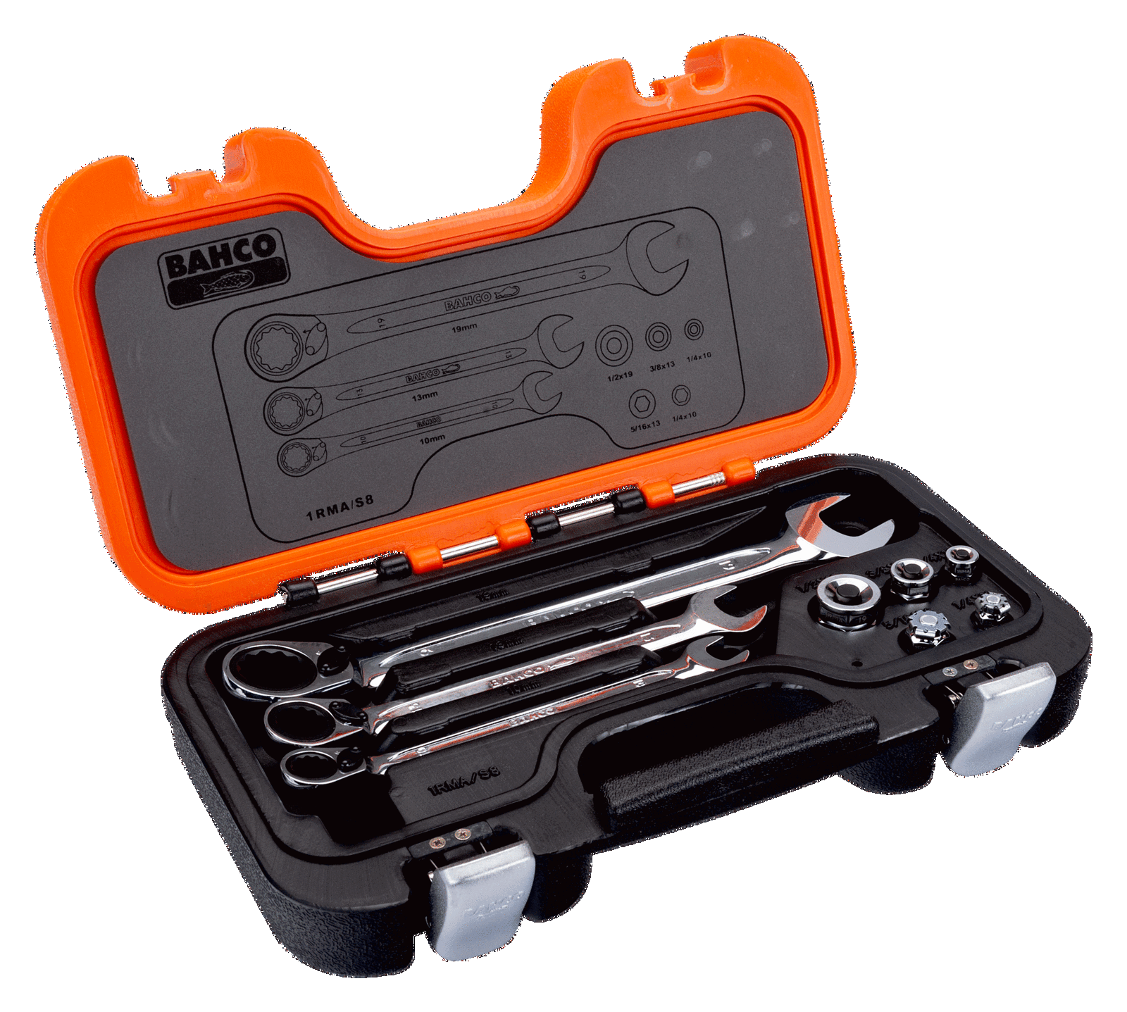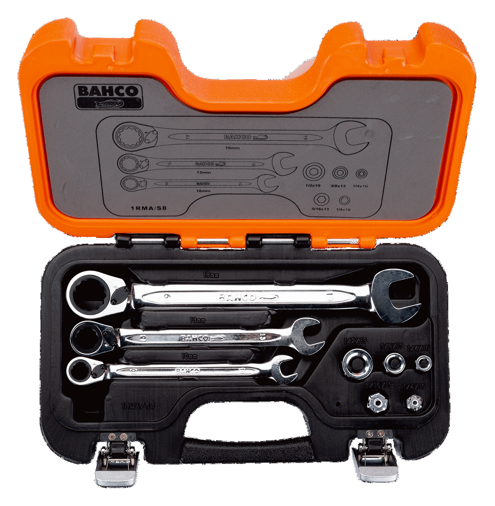Zestaw kluczy grzechotkowych płasko-oczkowych z przejściówkami, 8 szt. BAHCO