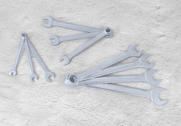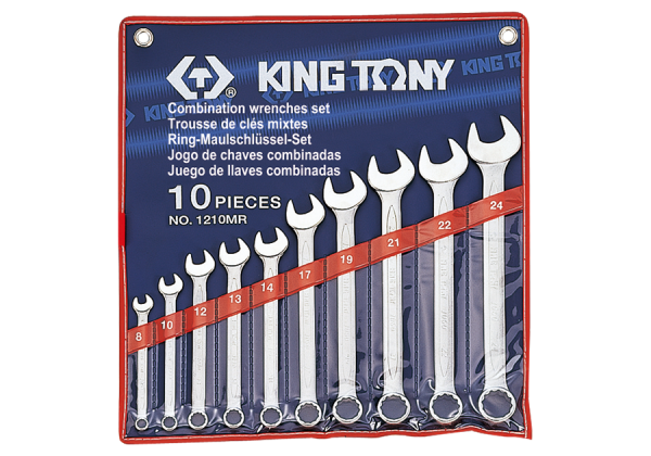 Zestaw profesjonalnych kluczy płasko-oczkowych, 10 części. Rozmiary 8, 10, 12, 13, 14, 17, 19, 21, 22, 24. Zestaw w etui ze wzmacnianymi uchwytami do powieszenia na ścianie. Karta produktu – 1210MR