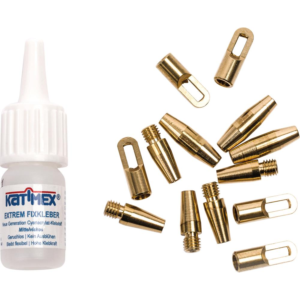 Zestaw naprawczy do taśmy złożony z 5 tulejek końcowych, 5 głowic prowadzących z oczkiem zaczepowym ∅ 6 mm, 3 tulejek łączących, specjalnego kleju 3 g i instrukcji obsługi.