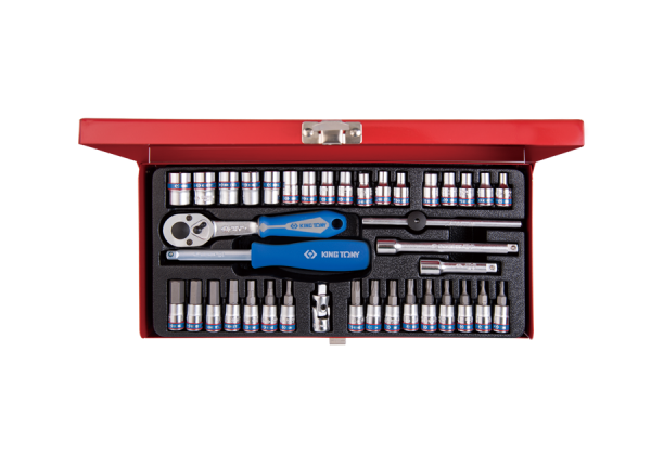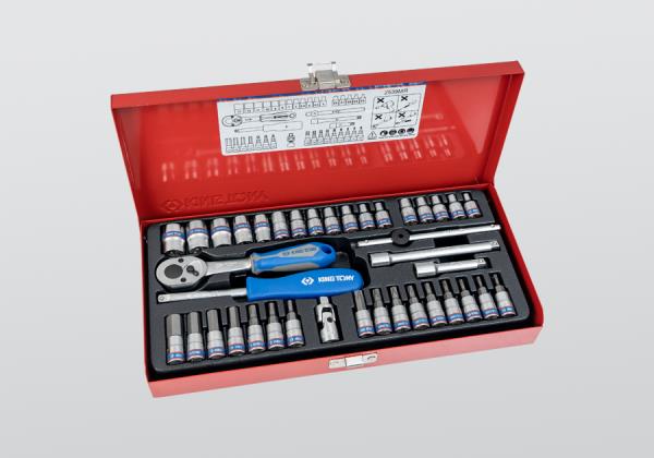 ZESTAW NARZĘDZI 1/4″ 39cz. NASADKI KRÓTKIE, 6-kąt. 4 – 13mm, T8 -T40, HEX 3 – 10, E4 – E8 Z GRZECHOTKĄ I AKCESORIAMI, KASETA King Tony