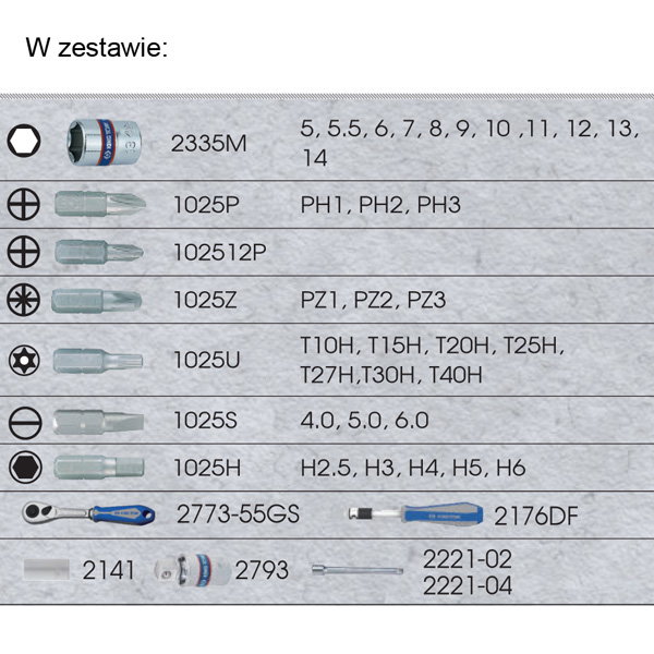 ZESTAW NARZĘDZI 1/4″ 39cz. NASADKI KRÓTKIE, 6-kąt. 5 – 14mm + BITY, Z GRZECHOTKĄ I AKCESORIAMI King Tony