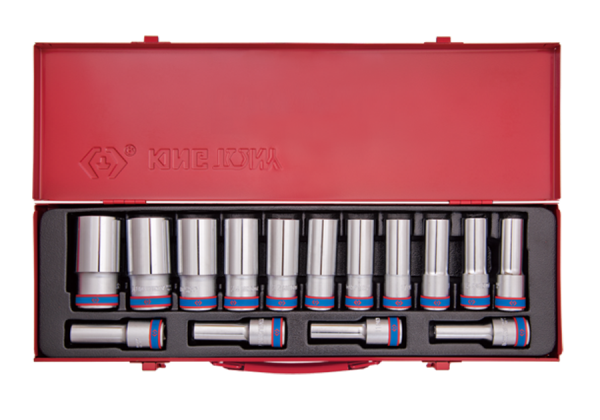 Zestaw długich nasadek 1/2″ King Tony. W zestawie znajdują się nasadki długie, 12-kątne w rozmiarach: 10, 11, 12, 13, 14, 15, 16, 17, 19, 21, 22, 24, 27, 30, 32. Zestaw w metalowej walizeczce. Karta produktu – 4215MR