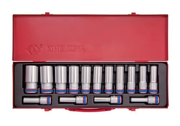 Zestaw nasadek 1/2″ firmy King Tony. W zestawie znajdują się długie nasadki 6-kątne w rozmiarach: 10, 11, 12, 13, 14, 15, 16, 17, 19, 21, 22, 24, 27, 30 oraz 32 mm. Zestaw w metalowej kasecie. Karta produktu – 4315MR