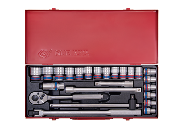 Zestaw narzędzi 1/2″ King Tony w metalowej kasecie. W zestawie znajdują się nasadki krótkie, 12-kątne w rozmiarach [ mm ]: 10, 11, 12, 13, 14, 15, 16, 17, 18, 19, 20, 21, 22, 23, 24, 27, 30, 32, nasadka do świec, 12-kątna, 21 mm, grzechotka z moletowaną rączką, pokrętło przesuwne, pokrętło łamane oraz dwie przedłużki. Karta produktu – 4026MR