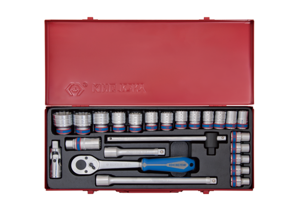 Zestaw narzędzi 1/2″ King Tony. W zestawie znajdują się nasadki krótkie, 6 kątne w rozmiarach [ mm ] 10, 11, 12, 13, 14, 15, 16, 17, 18, 19, 20, 21, 22, 23, 24, 27, 30, 32, nasadka do świec, 6-kątna, 21 mm, grzechotka z gumową rączką, pokrętło przesuwne, dwie chromowane przedłużki oraz przegub Kardana. Zestaw w metalowej kasecie Karta produktu – 4528MR
