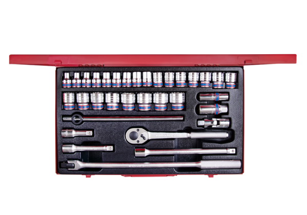 Zestaw 33 narzędzi 1/2″ King Tony. W zestawie znajdują się wszystkie nasadki 12-kątne z zakresu 8-30 mm oraz nasadka 32 mm. Oprócz tego w zestawie także 12-kątna nasadka do świec 21 mm, 6-kątna nasadka do świec 16 mm, przegub Kardana, trzy chromowane przedłużki, grzechotka z moletowanym uchwytem, pokrętło łamane oraz pokrętło przesuwne. Karta produktu – 4034MR