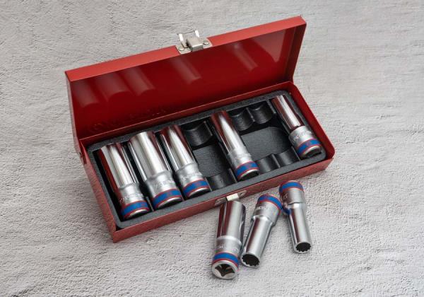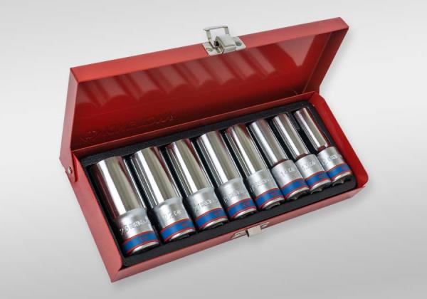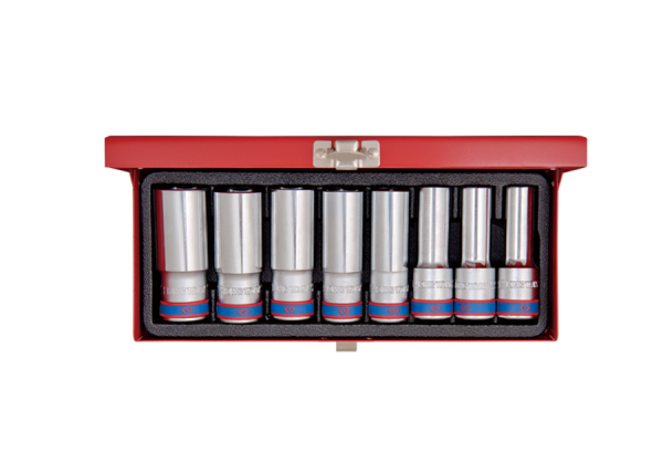 Zestaw długich nasadek 1/2″ firmy King Tony. Zestaw narzędzi w metalowym pudełku. W zestawie znajdują się nasadki w rozmiarach 12, 13, 14, 17, 19, 21, 22, 23. Karta produktu – 4208MR