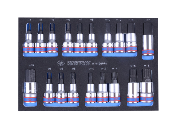 Zestaw nasadek 1/2″ z bitem 9-4129PRV King Tony, wkład do wózka z pianki EVA o wymiarach 280 x 187 mm. W skład zestawu wchodzą narzędzia: – nasadki 1/2″ z końcówką HEX w rozmiarach: H3, H4, H5, H6, H7, H8, H10, H12, H14, H17, H19, – nasadki 1/2″ z końcówką SPLINE w rozmiarach: M5, M6, M8, M10, M12, M14, – nasadki 1/2″ z końcówką SPLINE z otworem w rozmiarach: M16, M18. Część nasadowa wykonana jest ze stali chromowo-wanadowej i chromowana, a część robocza (bit) ze stali S2.