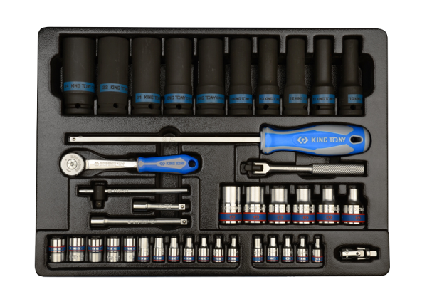 Zestaw narzędzi 1/4″ i 1/2″ King Tony we wkładzie do wózka warsztatowego. W zestawie znajdują się nasadki 1/4″ krótkie, 6-kątne w rozmiarach 4, 4.5, 5, 5.5, 6, 7, 8, 9, 10, 11, 12, 13, nasadki gwiazdkowe 1/4″ E4, E5, E6, E7, E8, nasadki 1/2″ gwiazdkowe E10, E12, E14, E16, E18, E20 oraz nasadki długie udarowe, 1/2″ 6-kątne 10, 11, 12, 13, 14, 17, 19, 21, 22, 24, przegub Kardana 1/4″, grzechotka 1/4″ z gumową rączką, pokrętło przesuwne 1/4″, pokrętło łamane 1/4″, uchwyt wkrętakowy do nasadek 1/4″ oraz dwie przedłużki 1/4″ Karta produktu – 9-7540MR