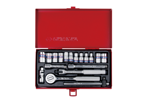 W zestawie:- 2335M – nasadka 1/4″ krótka 6-kątna w rozmiarach: 4, 4,5, 5, 6, 7, 8, 9, 10, 11, 12- 2310M – nasadka 1/4″ 8-kątna w rozmiarach: 8, 10- 2725-55F – grzechotka 1/4″ 24 zęby- 2452-05F – pokrętło łamane 1/4″, 130 mm – 2571-45 – pokrętło przesuwne 1/4″, 115 mm – 2221-02 – przedłużka 1/4″, 54 mm – 2221-04 – przedłużka 1/4″, 100 mm – 2792 – przegub kardana 1/4″ Karta produktu – 2518MR