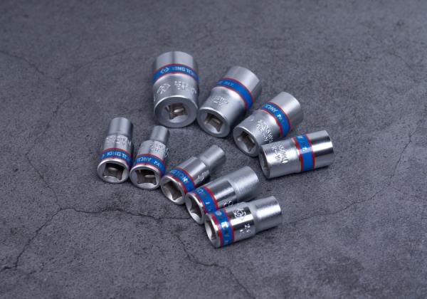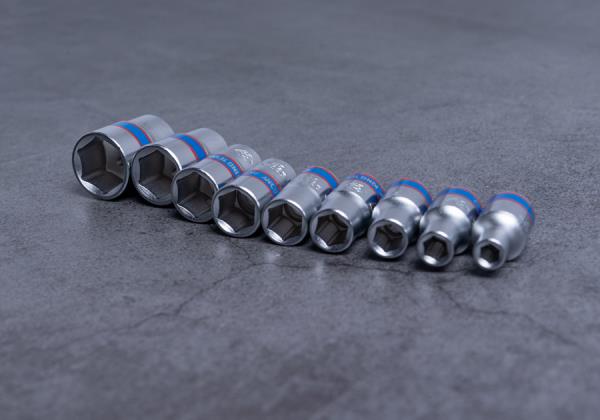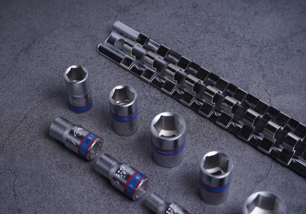 Zestaw 9 nasadek 1/4″ na szynie, łatwej do zamontowania na ścianie warsztatu. W zestawie nasadki w rozmiarach 4, 5, 6, 7, 8, 9, 10, 11, 13 Karta produktu – 2509MR