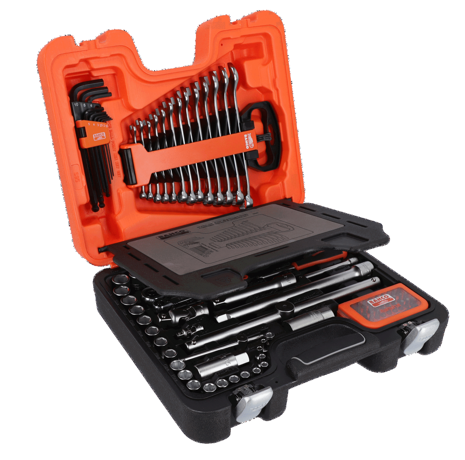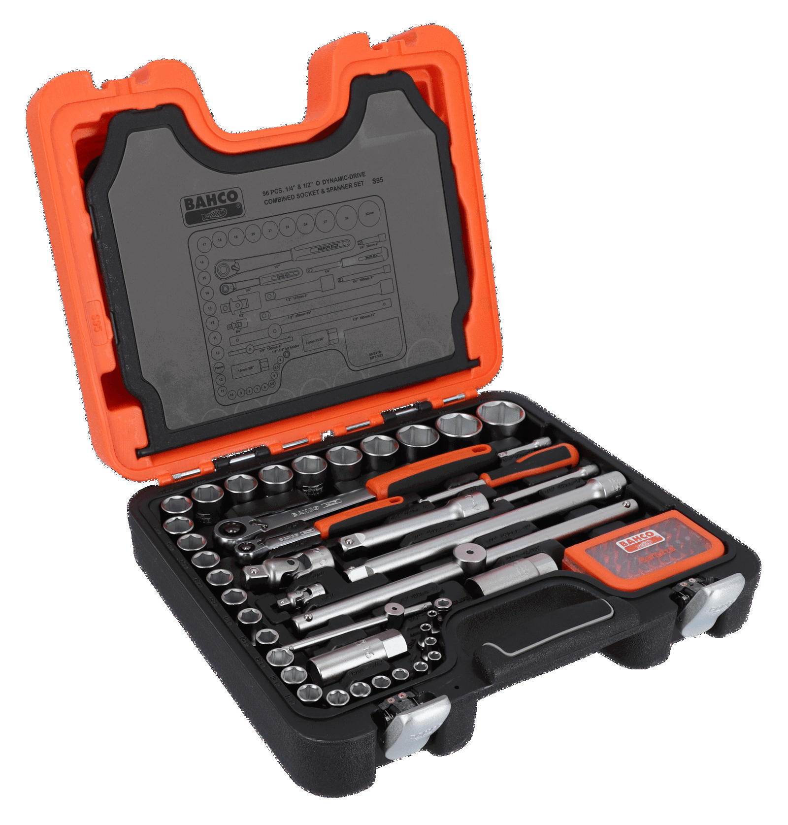 Zestaw nasadek 1/4″ i 1/2″ z kluczami złożonymi i sześciokątnymi kluczami L – 95 części BAHCO
