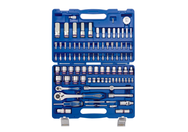 Zestaw narzędzi King Tony 7096MR, 96 elementów. Zestaw zawiera: – nasadki krótkie 12-kątne 1/4″ w rozmiarach 4, 4.5, 5, 5.5, 6, 7, 8, 9, 10, 11, 12, 13, 14 mm, – nasadki krótkie 12-kątne 1/2″ w rozmiarach 10, 11, 12, 13, 14, 15, 16, 17, 18, 19, 20, 21, 22, 24, 27, 30, 32 mm, – nasadki długie 12-kątne 1/4″ w rozmiarach 6, 7, 8, 9, 10, 11, 12, 13 mm, – nasadki długie 12-kątne 1/2″ w rozmiarach 14, 15, 17, 19, 22 mm, – nasadki 1/4″ z bitami PZ1, PZ2, PH1, PH2, TORX (T8, T10, T15, T20, T25, T27, T30), HEX (H3, H4, H5, H6), płaskie (4, 5.5 ,6.5), – nasadki do świec 1/2″ 12-kątne z wkładką gumową w rozmiarach 16, 21 mm, – bity 8mm krótkie: PZ3, PZ4, PH3, PH4, TORX (T40, T45, T50, T55), HEX (H7, H8, H10, H12, H14), płaskie (8×1.2, 10×1.6, 12×2.0), – adapter do bitów na klucz 1/2″, – grzechotki 1/4″ (2771-55G) i 1/2″ (4771-10G) z gumową rękojeścią i przyciskiem zwalniającym, – imbusy krótkie (1.5, 2, 2.5 mm), – przeguby kardana 1/4″, 1/2″, – adapter z 3/8″ na 1/2″ (z otworem do zastosowania wraz z przedłużką 1/2″ 250 mm jako pokrętło przesuwne), – przedłużki 1/4″ o długości 55 i 100 mm, – przedłużki 1/2″ o długości 125 i 250 mm (możliwość zastosowania przedłużki 250 mm wraz z adapterem 3/8″ ma 1/2″ jako pokrętła przesuwnego), – pokrętło przesuwne 1/4″, – wkrętak do nasadek 1/4″, – mini pokrętło 1/4″ idealne do trudno dostępnych miejsc z możliwością mocowania bitów 1/4″, – adapter 1/4″ umożliwiający mocowanie nasadek 1/4″ do mini pokrętła.