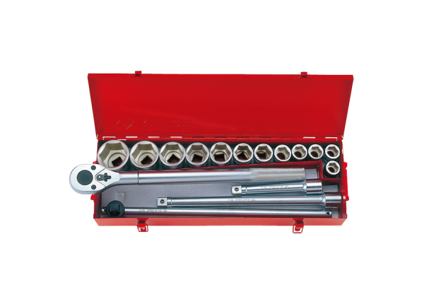 W zestawie znajdują się nasadki krótkie 6-kątne w rozmiarach 21, 22, 23, 24, 25, 30, 32, 36, 38, 41, 46, 50, grzechotka z moletowanym uchwytem, dwie chromowane przedłużki oraz pokrętło przesuwne. Zestaw w metalowej kasecie Karta produktu – 6316MR