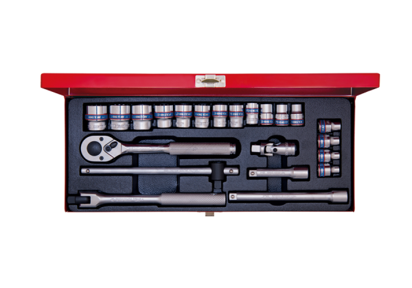 Zestaw 22 narzędzi 3/8″ King Tony w metalowej kasecie. W zestawie znajdują się nasadki krótkie, 6-kątne w rozmiarach 6, 7, 8, 9, 10, 11, 12, 13, 14, 15, 16, 17, 19, 20, 21, 22, grzechotka z gumową rączką, pokrętło łamane, pokrętło przesuwne, dwie przedłużki oraz przegub Kardana Karta produktu – 3523MR