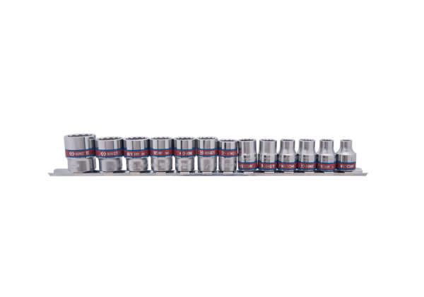 Zestaw 13 nasadek 3/8″ King Tony na szynie długości 290 mm. Szyna łatwa w montażu na ścianie. W zestawie krótkie nasadki 12-kątne w rozmiarach calowych 1/4″, 5/16″, 11/32″, 3/8″, 7/16″, 15/32″, 1/2″. 9/16″, 19/32″, 5/8″, 11/16″, 3/4″, 13/16″. Karta produktu – 3013SR