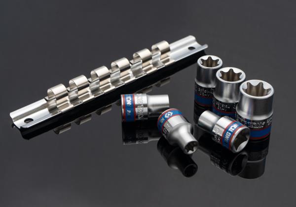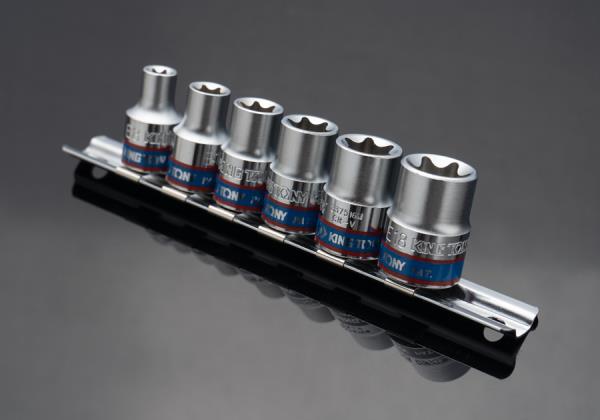 Zestaw 6 krótkich nasadek gwiazdkowych 3/8″ na szynie 150 mm. W zestawie nasadki E8, E10, E12, E14, E16, E18 Karta produktu – 3106PR