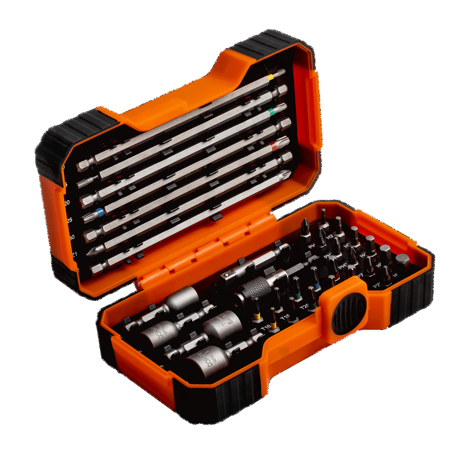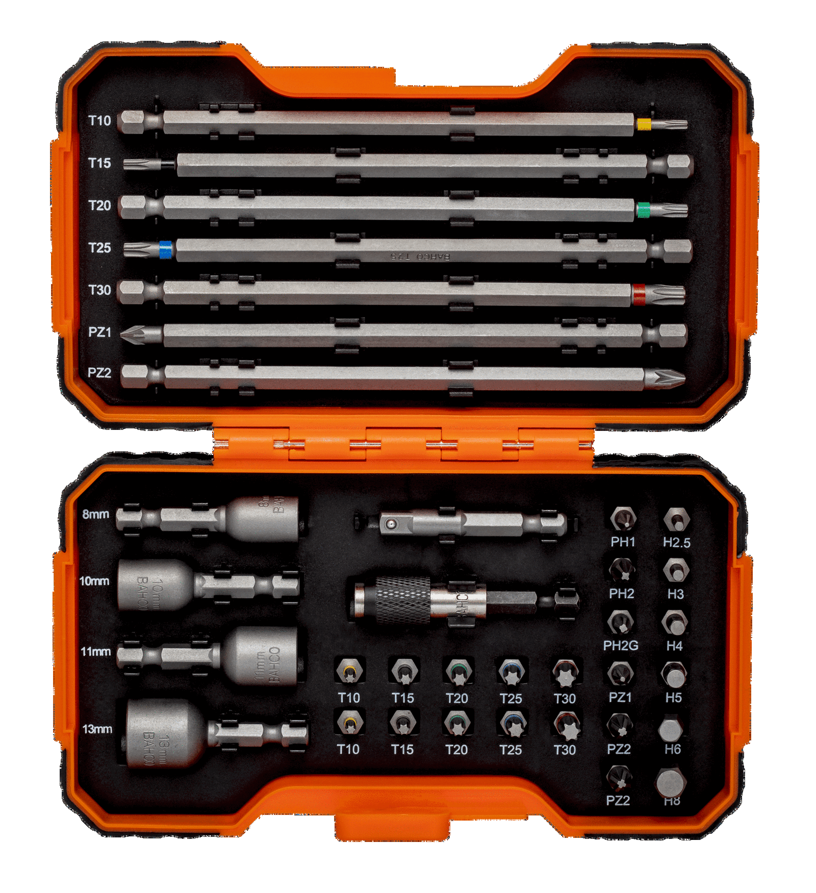 - Zestaw zawiera 35 sztuk: 29 bitów, 4 magnetyczne klucze nasadowe, 1 magnetyczny uchwyt na wiertła do szybkiego uwalniania i 1 adapter do nasadki