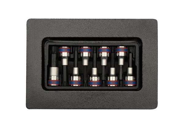 Zestaw nasadek z końcówką TORX King Tony pasujący do wózków narzędziowych. W zestawie 9 nasadek 1/2″ z końcówką TORX w rozmiarach T20, T25, T27, T30, T40, T45, T50, T55, T60 Karta produktu – 9-4119PR