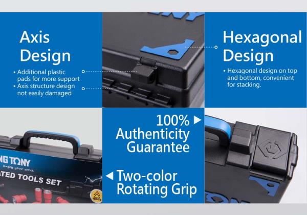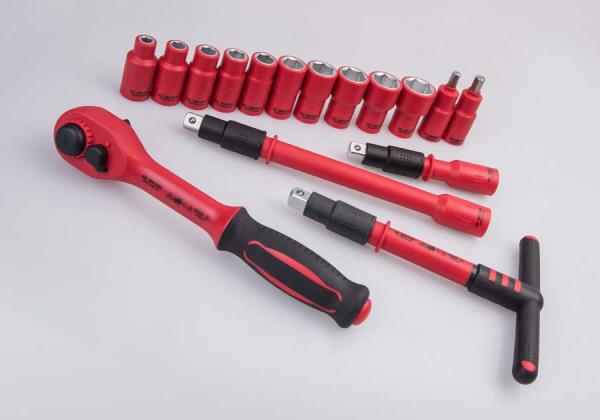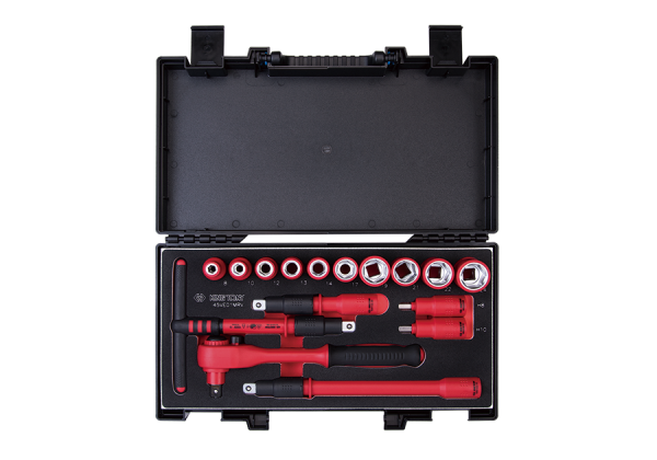 W zestawie:- nasadki w rozmiarach: 8, 10, 12, 13, 14, 17, 19, 21, 22, 24 mm,- nasadki z końcówką HEX w rozmiarach: H8, H10, – przedłużki w rozmiarach: 5 i 10, dł. 125 i 250 mm,- grzechotka, dł. 250 mm,- uchwyt typu T do nasadek, dł. 200 mm. Wymiary walizki: 389 x 230 x 66 mm. Narzędzie zgodne z normą IEC 60900:2004 Karta produktu – 45VE01MRV