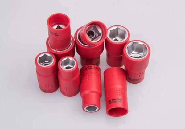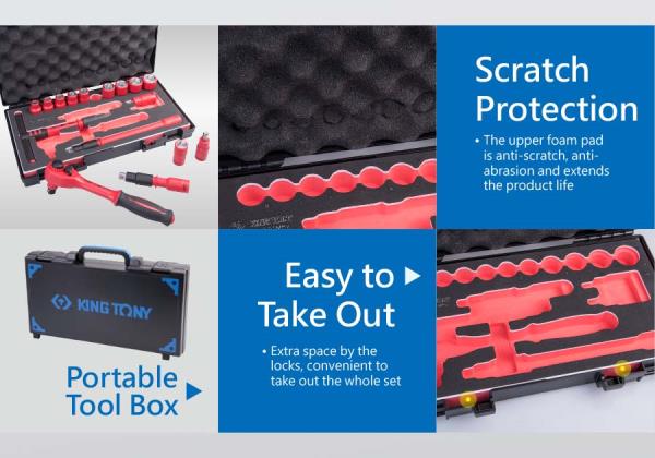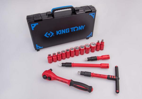 ZESTAW NASADEK IZOLOWANYCH 1/2″ 16cz. KRÓTKIE, 6-kąt. 8 – 24mm, Z AKCESORIAMI, CHROM, KASETA Z TWORZYWA King Tony