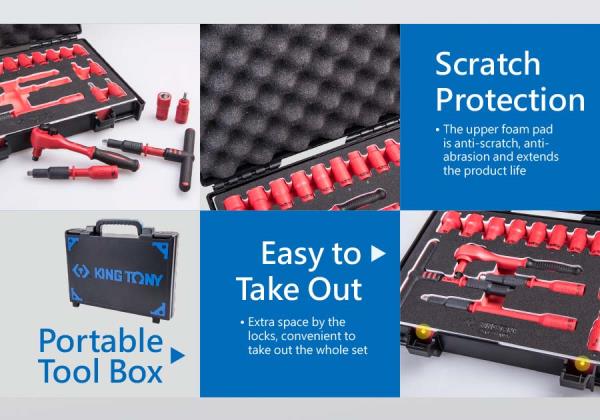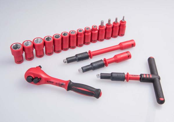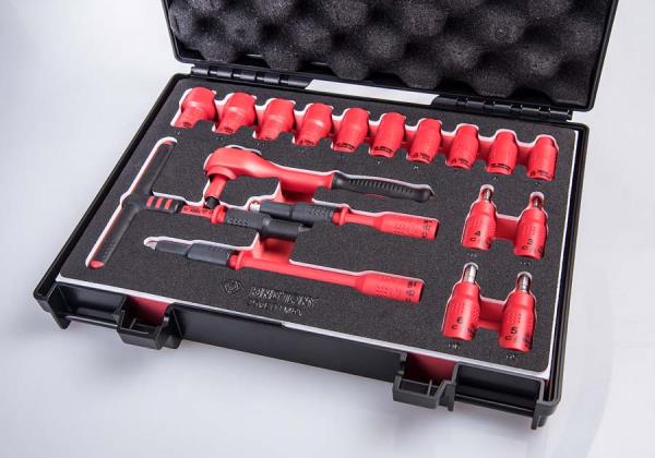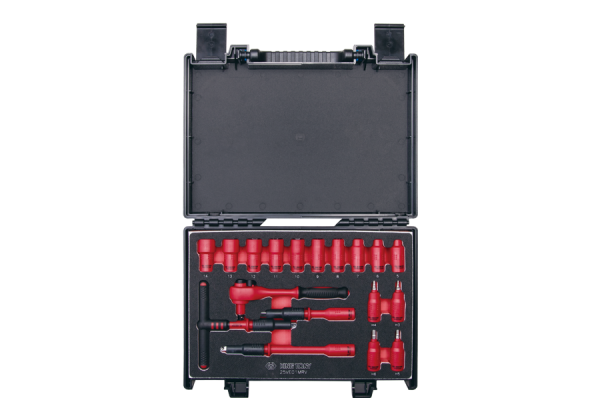 Izolowane narzędzia dla profesjonalnych elektryków i instalatorów posiadają certyfikaty GS i VDE, które zapewniają pewność pracy na potencjalnie wysokim napięciu ze świadomością, że narzędzia są wysokiej jakości i spełniają wymogi bezpieczeństwa.W zestawie:- nasadki 2335VE w rozmiarach: 5, 6, 7, 8, 9, 10, 11, 12, 13, 14 mm – nasadki z końcówką HEX 2035VE w rozmiarach: H3, H4, H5, H6 – przedłużki 2221VE w rozmiarach: 4 i 6 o długościach 100 i 150 mm – grzechotka 2771VE o długości 150 mm – uchwyt typu T do nasadek 2178VE o długości 125 mm. Wymiary walizki 289 x 230 x 66 mm. Karta produktu – 25VE01MRV