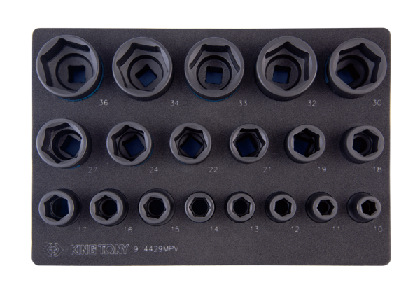 ZESTAW NASADEK UDAROWYCH 1/2″ 19 cz. KRÓTKIE 6-KĄT, 10 – 36mm, WKŁAD Z PIANKI EVA DO WÓZKA King Tony