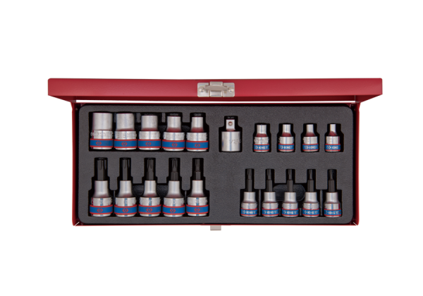 Zestaw nasadek gwiazdkowych oraz nasadek z końcówką TORX firmy King Tony. W zestawie znajdują się nasadki gwiazdkowe 3/8″ w rozmiarach E6, E7, E8, E10, nasadki gwiazdkowe 1/2″ w rozmiarach E12, E14, E16, E18, E20, nasadki z końcówką TORX 1/2″ T30, T40, T45, T50, T55 oraz redukcja z 1/2 na 3/8″. Cały zestaw w metalowej kasecie. Karta produktu – 7120PR