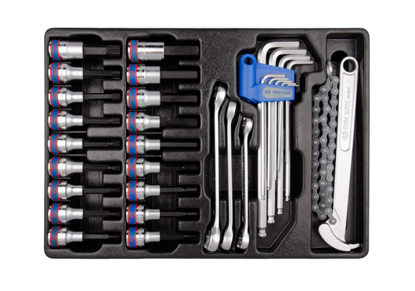 ZESTAW NASADKI Z BITAMI 1/2″ 20cz. IMBUSY DŁUGIE HEX Z KULKĄ 9cz. KLUCZ ŁAŃCUCHOWY DO FILTRA OLEJU 3204, WKŁAD DO WÓZKA King Tony
