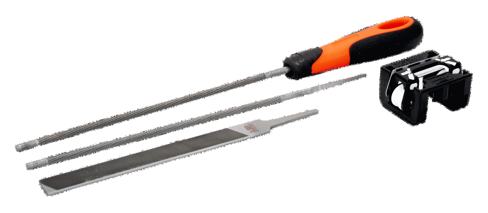 - Specjalna ostrzałka umożliwia właściwe ostrzenie przy użyciu zarówno pilnika okrągłego jak i płaskiego