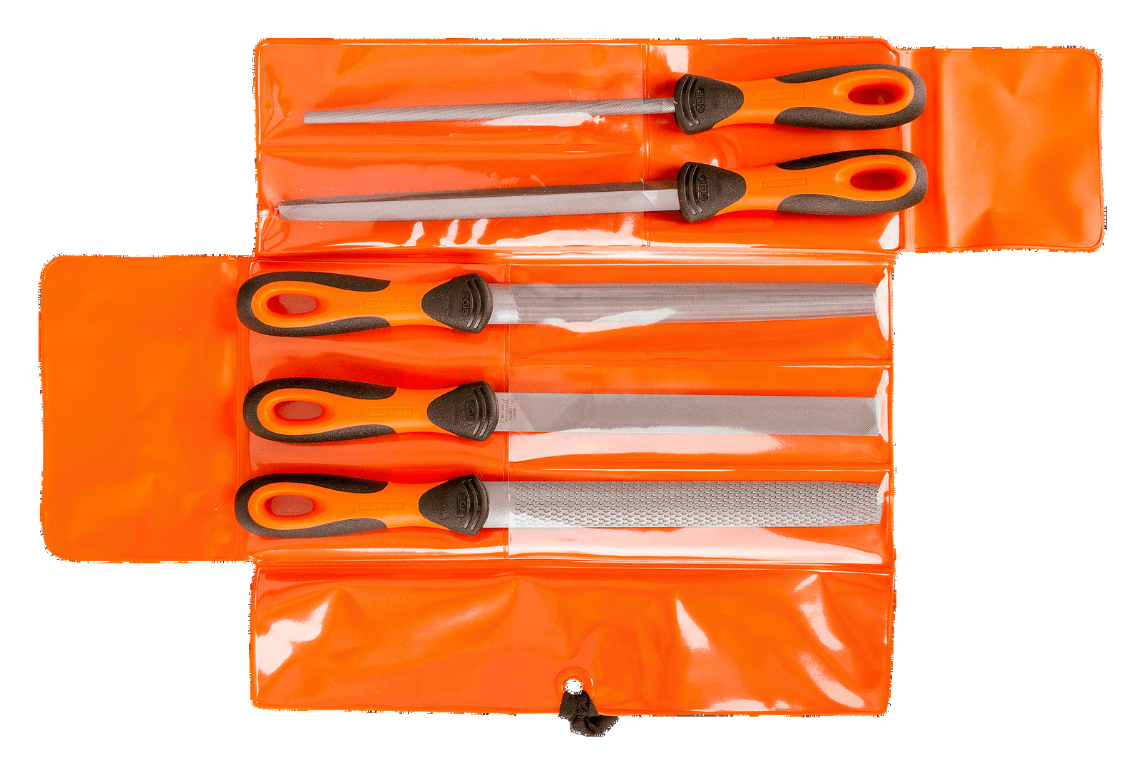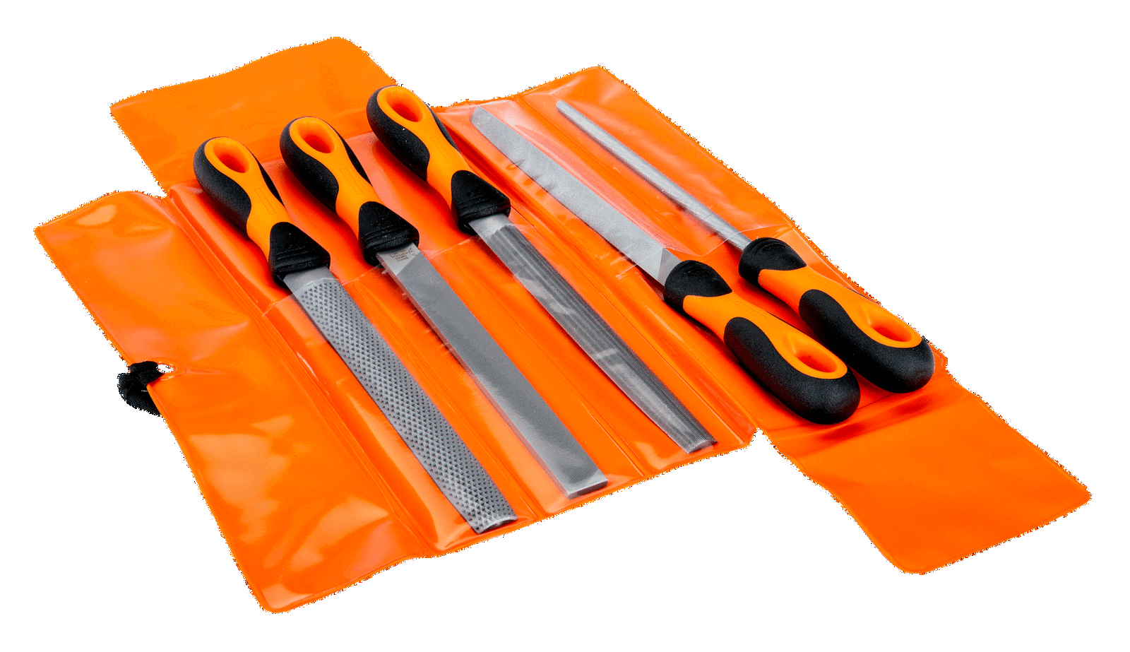 - Zawiera następujące pilniki: warsztatowy pilnik płaski, trójkątny, okrągły i półokrągły oraz półokrągły tarnik