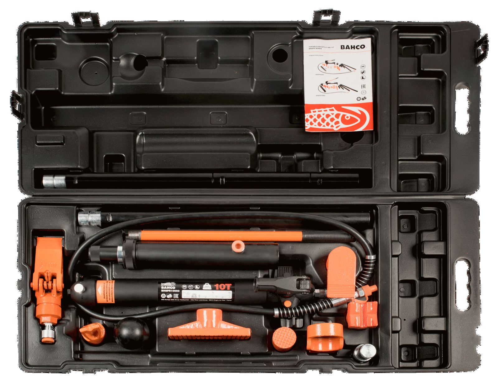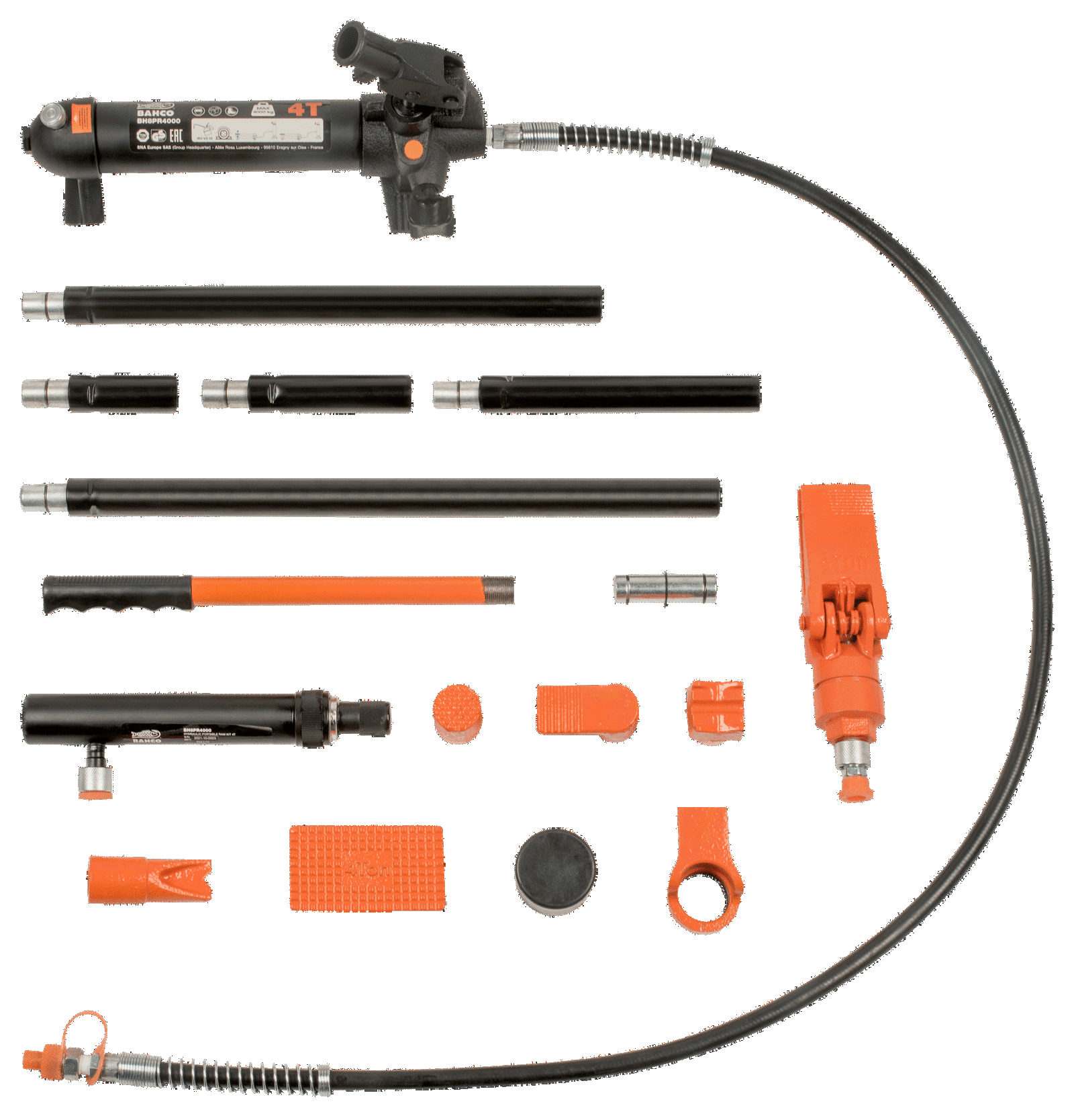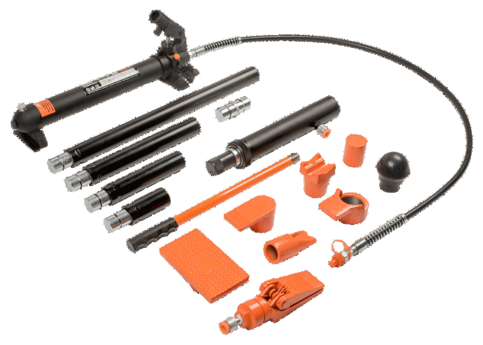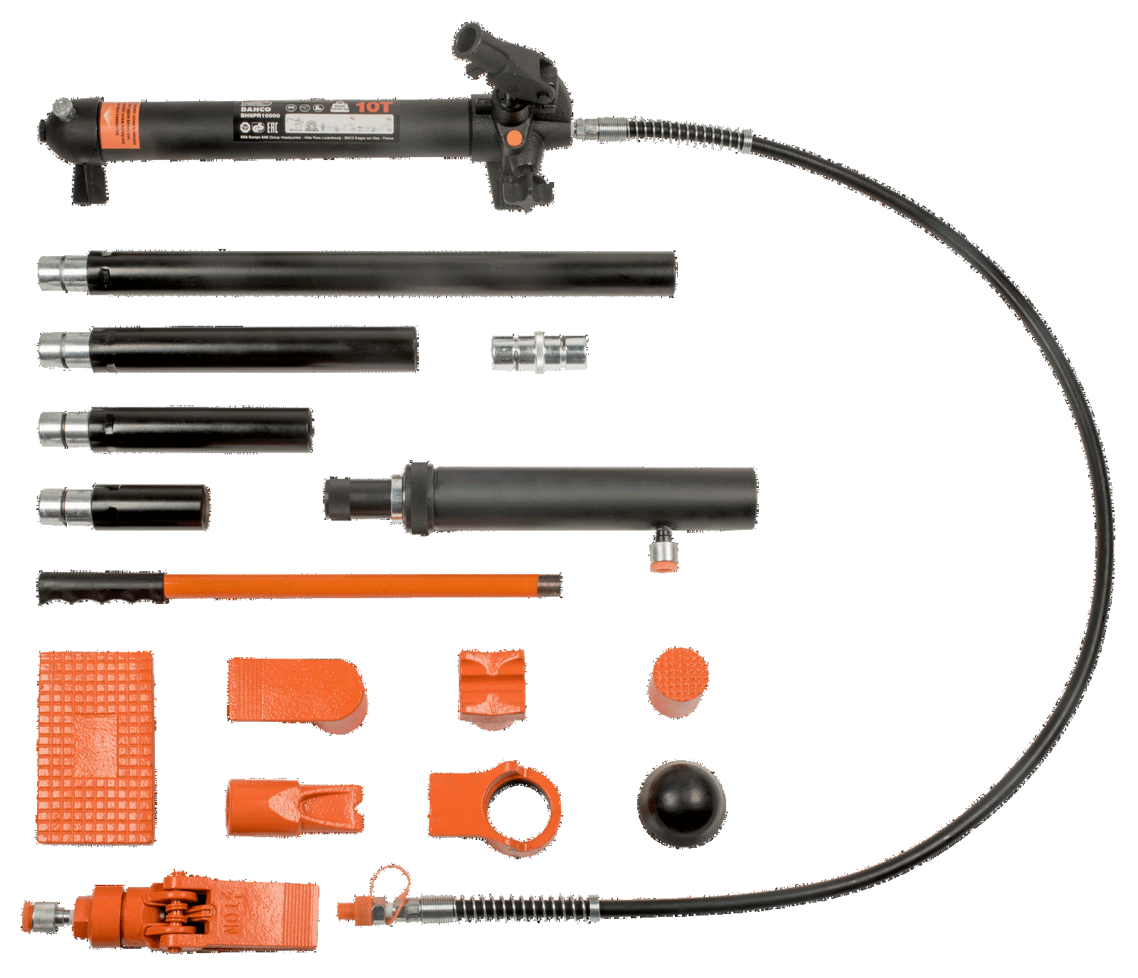- Zestaw zawiera: Pompka ręczna – siłownik, Wąż, Rozpierak, Nasadka kątowa, Nasadka gumowa, Nasadka płaska, Podstawa “V” 90°, Podpórka nacinana, Łącznik, Wybór przedłużek